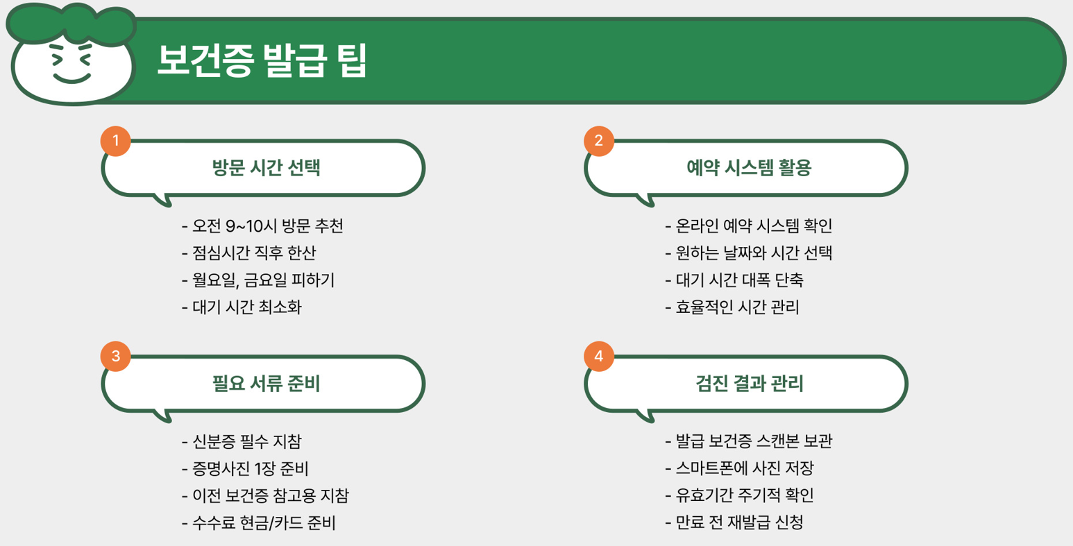 🌟 2025년 신규 정보: 일부 지역에서는 모바일 보건증 서비스를 시작했습니다. 스마트폰으로 언제든지 보건증을 제시할 수 있어 편리합니다. 지역 보건소 홈페이지에서 확인해보세요!