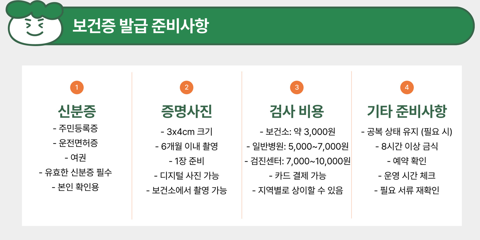 보건증 발급을 위해서는 다음 준비물이 필요합니다: