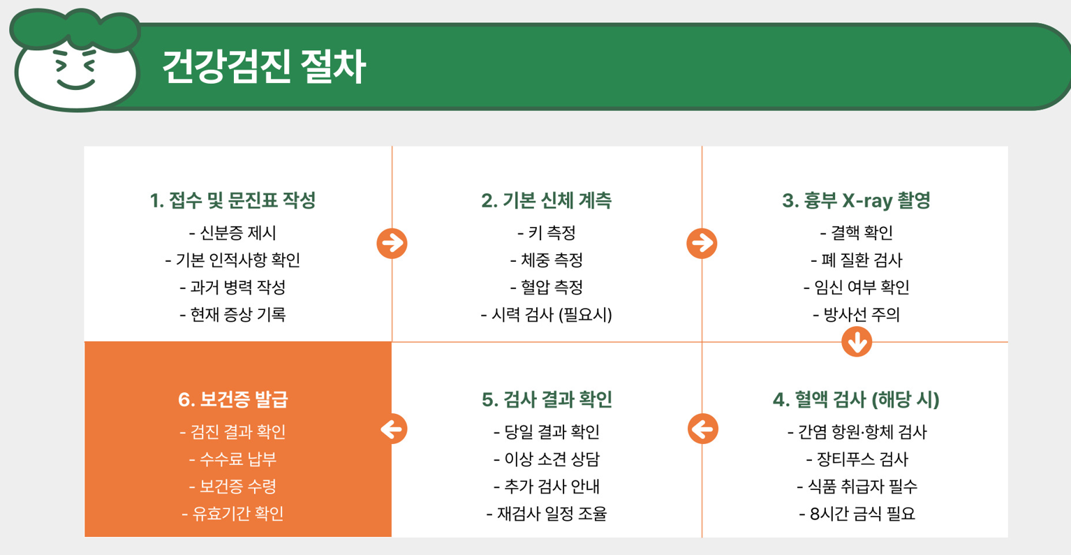 보건증 발급을 위한 건강검진은 다음과 같은 순서로 진행됩니다: