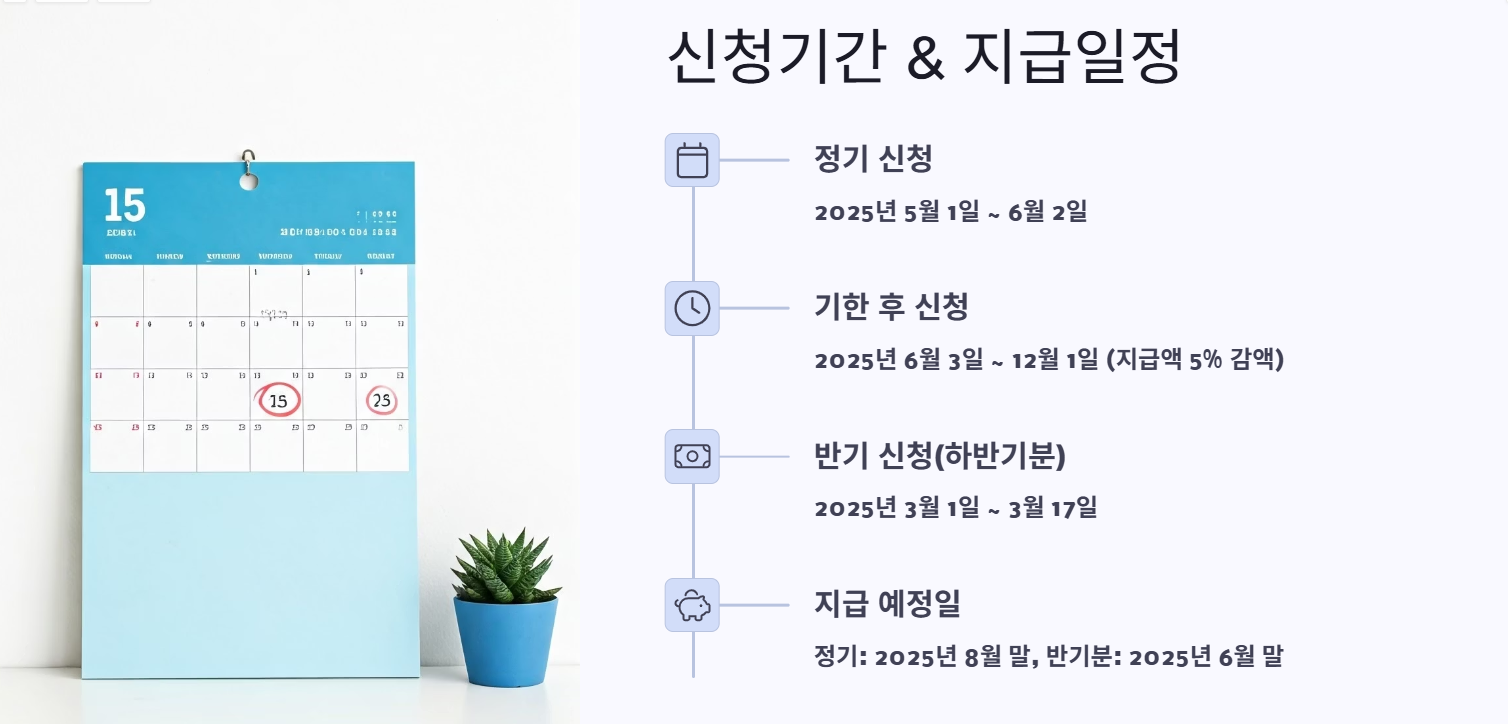 - 기한 후 신청: 2025년 6월 3일 ~ 12월 1일 (지급액 5% 감액)