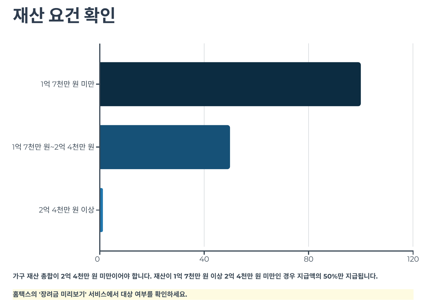 - 재산이 1억 7천만 원 이상 2억 4천만 원 미만인 경우 지급액의 50%만 지급