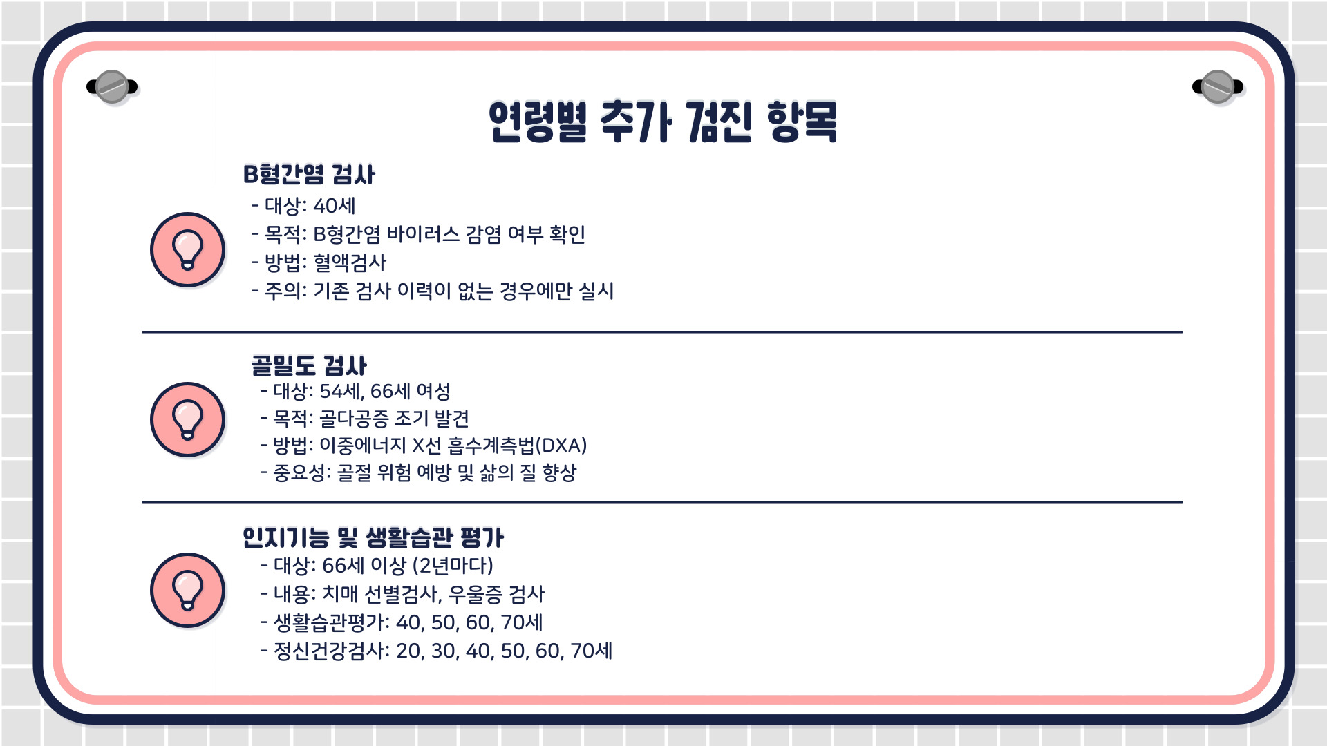 - B형간염 검사: 40세(단, 기존 검사 이력이 없는 경우)