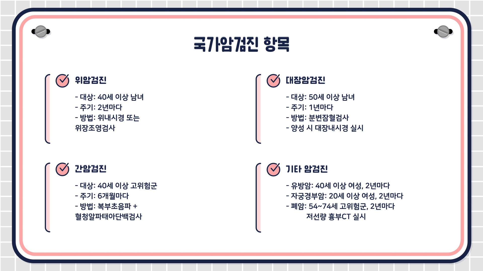 - 위암검진: 40세 이상 남녀, 2년마다 위내시경 또는 위장조영검사