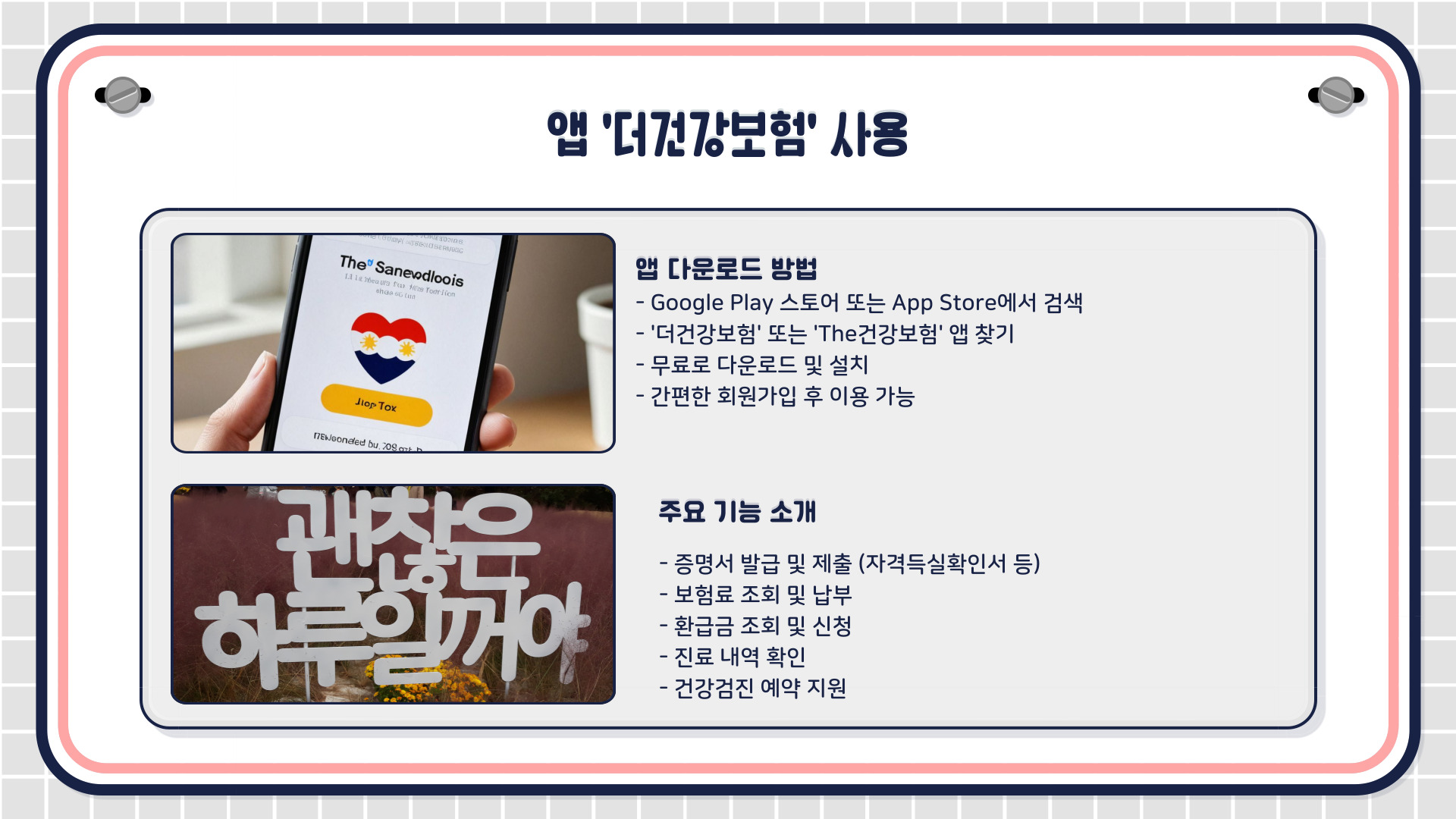 - 모바일 앱 '더건강보험' 또는 '건강iN' 설치 후 이용