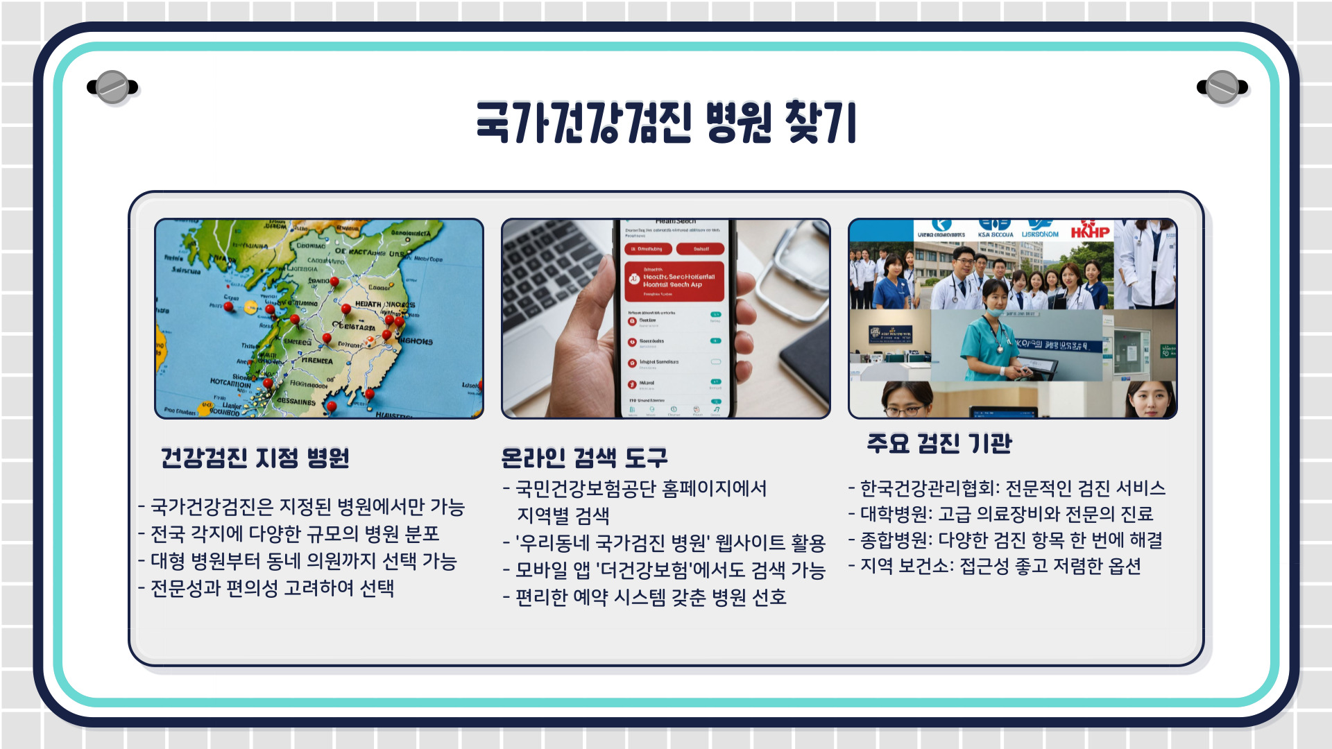 검진 대상자라면 다음은 어디서 받을 수 있는지 확인해봐야겠죠? 검진기관은 **'건강검진 지정 병원'**에서만 가능하며, 공단 홈페이지에서 지역별로 검색이 가능합니다.