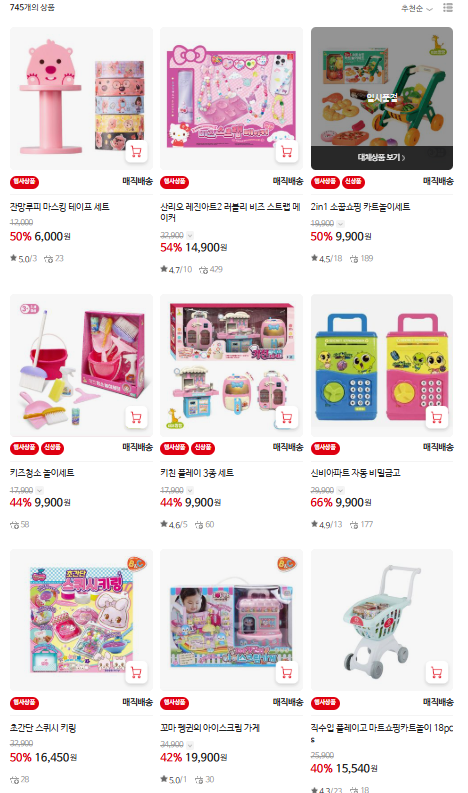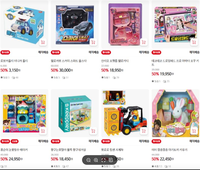 브랜드 제품까지 세일 품목에 포함되어 가성비가 정말 폭발적입니다! 평소 비싸서 망설였던 그 장난감들을 이제 합리적인 가격으로 만나보세요.
