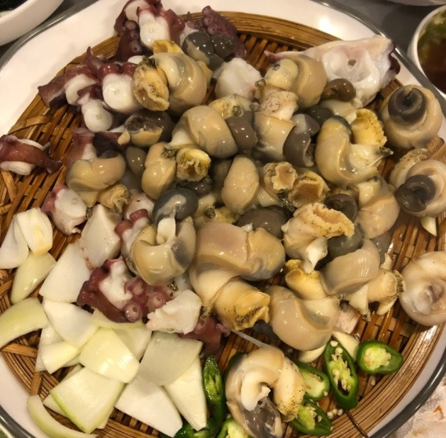 골뱅이숙회도 고소하니 문어와 정말 잘 어울립니다. 신선한 동해안 자연산 골뱅이를 사용하여 쫄깃한 식감과 고소한 맛이 특징입니다.