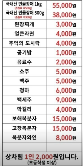 ※ 상차림비 1인 2,000원 (초등학생 이상)