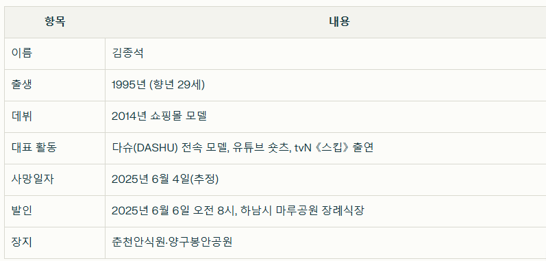 2025년 6월 4일, 모델이자 콘텐츠 크리에이터로 활동했던 김종석이 29세의 나이로 세상을 떠났습니다. 그의 갑작스러운 부고는 많은 팬들과 업계 관계자들에게 깊은 슬픔과 충격을 안겼습니다. 6일 오전 8시 하남시 마루공원 장례식장에서 조용히 발인이 이루어졌으며, 고향인 강원도 춘천안식원·양구봉안공원에서 영면에 들었습니다.