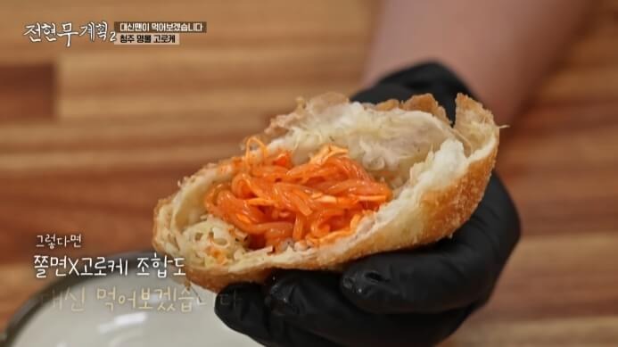 바로 바삭한 고로케 위에 매콤새콤한 쫄면을 올려 먹는 인생 조합!